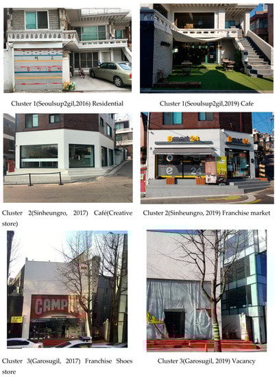 Cluster 3 has the lowest share of birth at 0.000. From this, it can be inferred that there is little residential use in cluster 3. The share of replacement depicts moderate transition between commercial uses of existing commercial space at 2.129. Vacancy, at 0.942, indicates a rather high vacancy rate. This trend is also evident in field surveys, and the increase in vacancies is one of the problems caused by commercial gentrification in Seoul. The index for homogenization stands at 1450.918, indicating that cluster 3 industry is somewhat homogenous in comparison to industry in cluster 2. Franchise figures and vitalization rates are 8.171 and 0.980, respectively, showing that streets in cluster 3 have been mostly franchised and transformed into commercialized spaces. The average front width of stores is 8.027 m, and it can be seen that large-scale physical change has occurred with commercial gentrification. Figure 3 shows the scale of buildings expanding entrances to franchise stores with large capital.