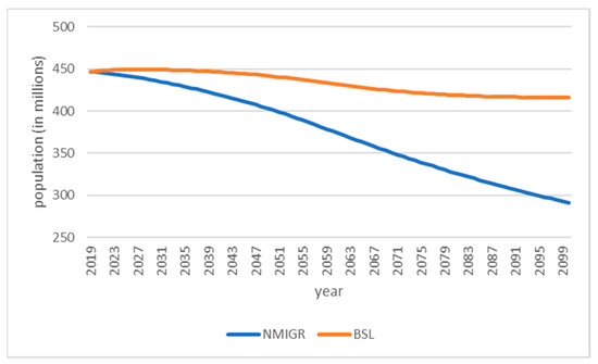 It is foreseeable that in the case of a scenario without migration (non-migration, NMIGR) Europe will lose 120 million more inhabitants within 100 years than in the baseline scenario (BSL). From Figure 1 and the same data sources there follow Figure 2. The declining ratio between the working-age and population aged 65+ in the European Union declines faster in shrinking cities and in case of the no-migration scenario (BSL scenario).
