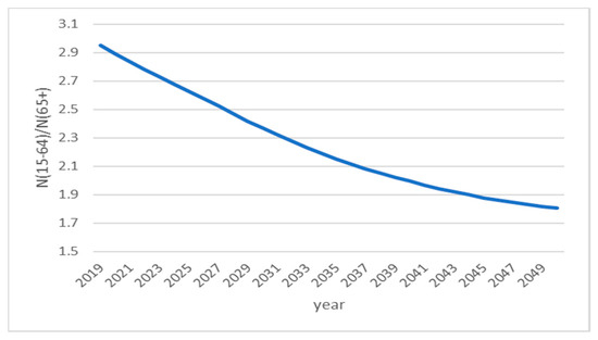 Low fertility as a generator and ageing as an indicator in Table 1 are associated with the declining size of the available labour force. This dynamic is deeply worrying in many European countries. For example, the European demographic projections are characterised by a rapidly decreasing ratio of the working-age population to the population aged 65 and more. Figure 1 shows the projections for the “no-migration” and “migration” scenarios, and Figure 2 shows the rapidly decreasing ratio of the working-age population to the population aged 65 and more. The ratio falls from 2.9 in 2020 to 1.8 in 2050 (Baseline Scenario-BLS). However, this dynamic varies considerably both between countries and between cities and regions within countries, as calculated on the basis of the 2018 Ageing Report: Economic and Budgetary Projections [20] and updated by the statistical office of the European Union-EUROSTAT in 2020 [21].