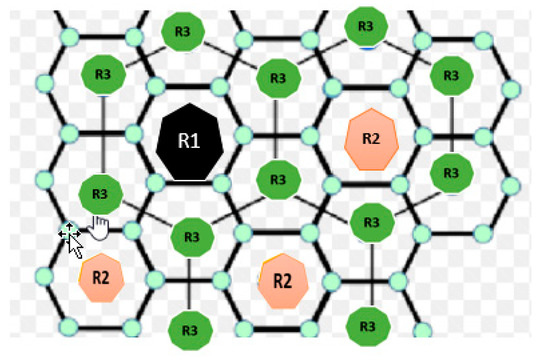 According to Christaller’s CPT, a central place is a city or a town as a node of a region (in Figure 3, there are cities, R1, smaller towns, R2, and/or even smaller towns, i.e., market towns, R3), where a node of a global supply chain can also be located. Cities, R1, also cover the areas of the hexagons that belong to the nearest towns, R2. Each town, R2, also hierarchically covers the areas of the hexagons that belong to the nearest market towns, R3.