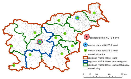 In Slovenia, this hierarchical structure, which shows NUTS 1 (state) level with the central place Ljubljana, NUTS 2 level with the central places Ljubljana (governs Western Slovenian Region) and Maribor (governs Eastern Slovenian Region) on the lower level, and the central places of the NUTS 3 regions, is shown in Figure 4. Geographic and political influences greatly shifted the edges of their surrounding areas from hexagonal shapes to something else.
