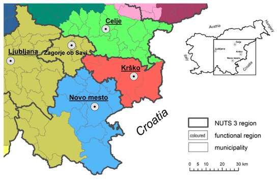 Krško and its neighbours with their NUTS-3 regions (given delineation curves) and their functional regions (coloured). Today in most both regions of Krško coincide (source of data: SMA, SORS [28,29] and own calculation).