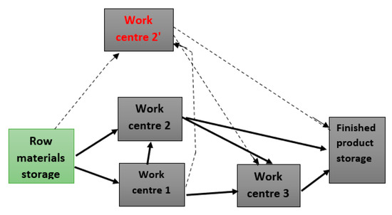 Flows of items in a SC can be transparent, as illustrated in an Extended Material Requirements Planning (EMRP) model. This model allows the observation and optimal control of the flows in a chain. In the city j, which is shrinking and not sustainable, any activity cell-node of a SC: production, distribution, or reverse logistics, can be located. Figure 7 shows how the distances between the activity cells increase when the activity cell marked “Work centre 2” moves from its previous location to distant areas (red colour).