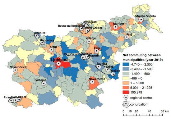 Net daily commuting between municipalities in Slovenia in 2019 (source of data-Statistical Office of the Republic Slovenia (SURS) [28]).