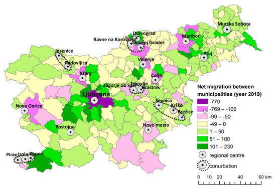 Net internal migrations between municipalities in Slovenia in 2019 (source of data-SURS [28]).