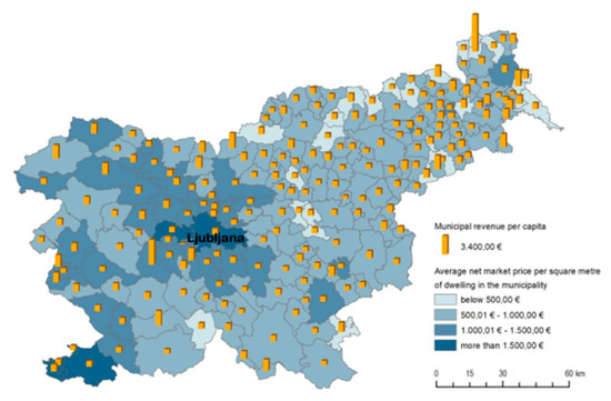 The market price of housing units on the basis of mass taxations and the municipal annual revenue per capita (source of data: the Database of the Surveying and Mapping Authority of the Republic of Slovenia (SMA) and Ministry of Finance of the Republic of Slovenia (MFRS) [27,28]).