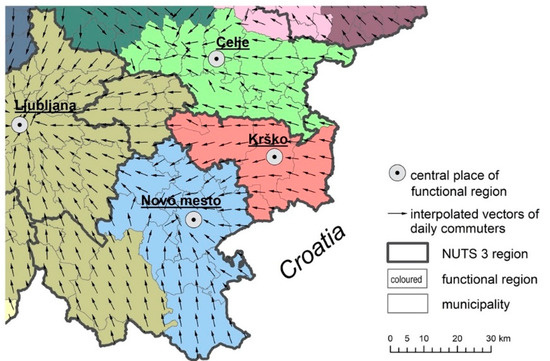 The SC “A” see that in Krško in the next 10 years the number of members of the cohort aged 15–65 years will decrease from 48,465 persons in 2020 to about 43,891 persons in 2030, i.e., by 9.4% (the baseline scenario). Among them, we have 67% active workers, others are students and people in various other contractual relationships that are not suitable for these activities of SC. The current migration and commuting vector of Krško is: [M.j Mj. C.j Cj.] = [825 853 40,118 5182]. The map of location with interpolated vectors of daily commuters is shown in Figure 11. It is obvious that most commuters from Krško (FR) commute to Novo mesto (FR).