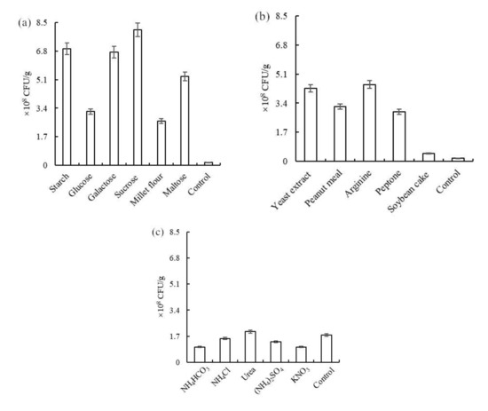 The effects of different carbon and nitrogen sources on spore production under peat soil substrate were determined. As shown in Figure 1, the maximum spore production (8.06 × 108 CFU/g, 4.48 × 108 CFU/g, 2.00 × 108 CFU/g) was observed when sucrose, arginine and urea served as the carbon sources, organic nitrogen sources and inorganic nitrogen sources, respectively.
