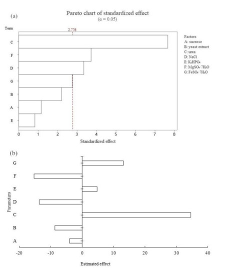 Visualization of the effects of seven variables by PBD. (a) Pareto chart by analyzing spore production; (b) estimated effects of experimental parameters on spore production.