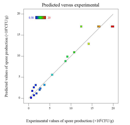 The corresponding analysis of variance (ANOVA) for the RSM model of spore production is presented in Table 5 according to the experimental data of CCD. The F value is a measure of the variation in the mean value. Generally, the accurate prediction of the experimental results was evaluated by the high calculated F value [33]. As shown in Table 5, the high F value of 21.01 at a p-value of <0.0001 was indicative of the high correlation of the model to the experimental results. The F value (21.01) of the model was also much greater (85.67%) than the tabulated F value (F9,10 = 3.02) at 0.05 level, which demonstrates that the quadratic polynomial of Equation (5) is highly significant.