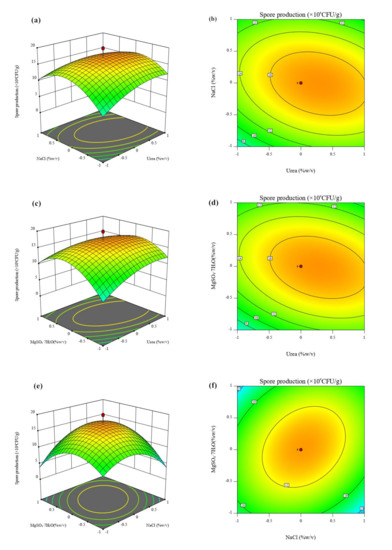 The individual and interactive effects of variables on the spore production of Streptomyces griseorubens JSD-1 employing 3D and 2D plots. (a,b) Effects of NaCl and urea on spore production; (c,d) effects of MgSO4·7H2O and urea on spore production; (e,f) effects of MgSO4·7H2O and NaCl on spore production.