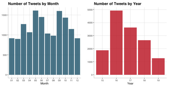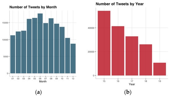 (a) Number of tweets by month, (b) Number of tweets by year.