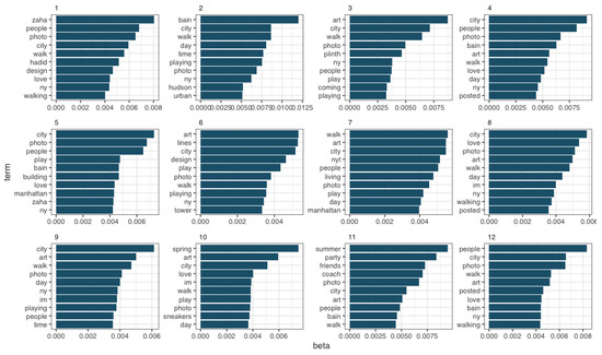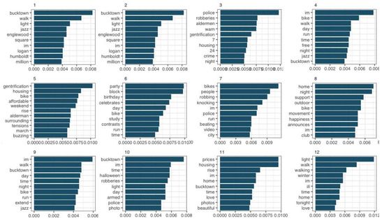The topic analysis reveals the changes in topic by month (Figure 3). During the winter season, from December to February, park users frequently mentioned “light” and “walk” (or “walking”). Compared to the other season, “jazz” was also mentioned in January and February. Some of the main topics of the spring were worries such as “robberies”, “crime”, and “gentrification”. From March to May, people tweeted worries liked “robberies”, “police”, “crime”, “night”, “gentrification”, and “housing”. They also mentioned “tensions” and “buzzing” to express their feelings. Among the spring months, April shows a different result compared to other months. In April, people mentioned activities such as “bike” and “walk” frequently, and events such as “free jazz night”. In the summer season, park users mentioned physical activities such as “walk”, “bike”, “run”, with their status such as “happiness”. For the last, during the fall season, people liked to take “photos”. Compared to other seasons, people mentioned “photos” in the fall season more often. They also tweeted “beautiful” in November, which was the first time that they described their feelings about the scenery. Overall, park users worried about “housing”, “prices”, and “crimes” in the 606. Generally, they liked to do physical activities during all seasons; however, the intensity of physical activity may differ from season to season, from light walking in the winter to running in summer.