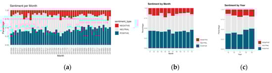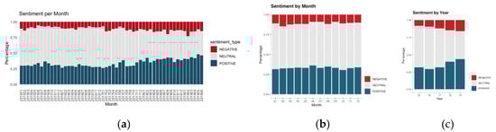 (a) Sentiment per month, (b) Sentiment by month, (c) Sentiment by year of the 606.