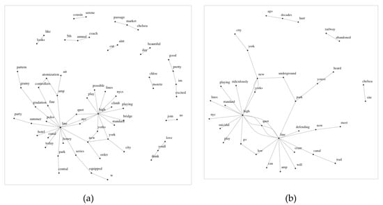 The bigram network of positive sentiment represents related keywords (Figure 9a). For example, one of the clusters includes “im” (I’m), “pretty”, and “good”. Some clusters show the events in the High Line, including “friends”, “coach”, “annual”, and “5th”. The main cluster shows a number of keywords related to the city. “Central” and “Park” are also frequently mentioned with the High Line. From these results, one of the biggest reasons of the High Line’s success can be considered a scenic urban view and the city itself. Regarding the negative sentiments (Figure 9b), the bigram network analysis shows some keywords like “abandoned” with “railroad” and “chelsea” with “site”. An important caveat here is that lexicon-based sentiment analysis methods cannot always extract the full sentiment of a complex sentence. Thus, the sentiment analysis here should be considered a starting point for a deeper understanding of user opinions.