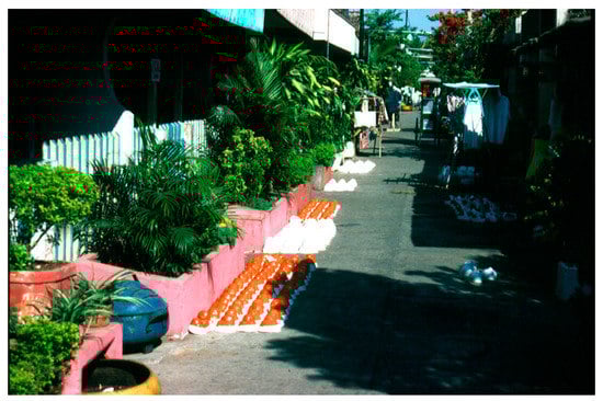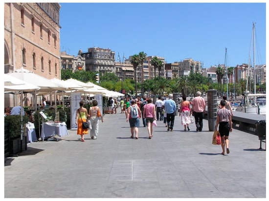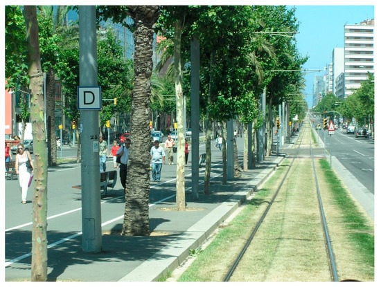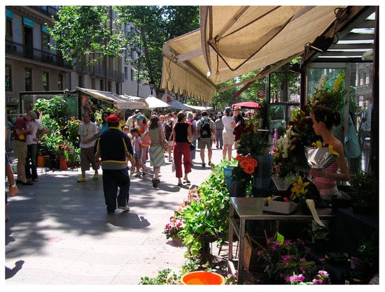 The perception about a city is generally formed by its public open spaces, particularly its streets []. They give life to the city, creating its unique identity and providing space for human interactions to occur through a diversity of uses []. In this respect, Figure 2 depicts La Rambla in Barcelona, Spain, which beautifully serves the multiple roles of movement space for pedestrians, access to properties that front the street, a place to spend time and enjoy the colourful, green, and vibrant activities that line the street (Figure 3), and an unbroken pathway to the more distant spacious open spaces of the city’s waterfront (Figure 4). This multiple function of streets in serving open space, accessibility, and movement functions is further depicted in Barcelona through the integration of quality public transport and walking facilities and open space functions in a dense urban setting, even along a major arterial road (Figure 5).