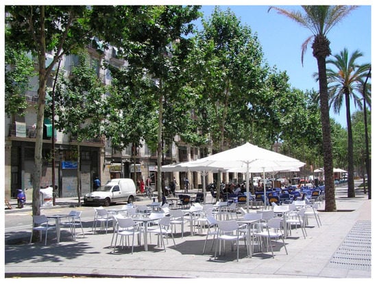 Looking at the city core of Barcelona (as shown in Figure 2, Figure 3, Figure 4 and Figure 5), New York, or Paris, green space is usually embedded within the street fabric, together creating an attractive, continuous spatial system for pedestrians to both move through and spend time in sedentary activities. This explains why dense European and American city centres that have relatively little POS (5–15%) but sufficient land allocated for streets (above 30%), are still well-liked by residents []. As Ståhle [] (p. 233) puts it: “It all has to do with how public open spaces are designed and located within the street-pathway system in relation to where people live”. Using London as an example, Rogers [] argues that for streets to function as POS they need to provide a diversity of uses stimulating the local economy, active facades allowing connections between the ground levels of the buildings and the pedestrians, human-scale constructions, green areas, shared space and safe circulation for all users, including public transport, and a specific identity that encourages social interactions.