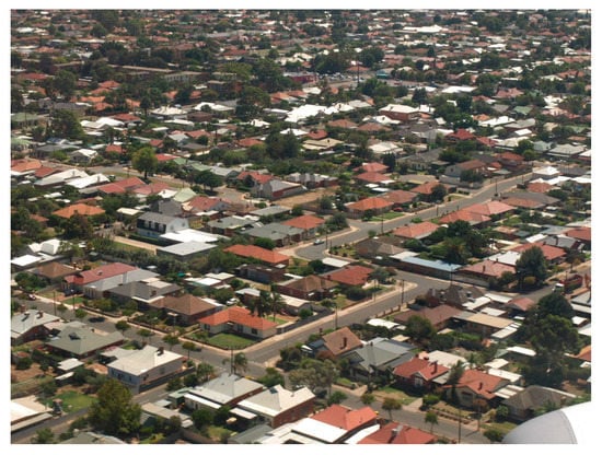 Aerial view of Adelaide suburban areas showing the dominance of low-density sprawl with little public green or other public space and streets designed as movement space. Source: Jeffrey Kenworthy.