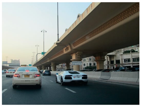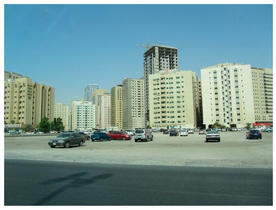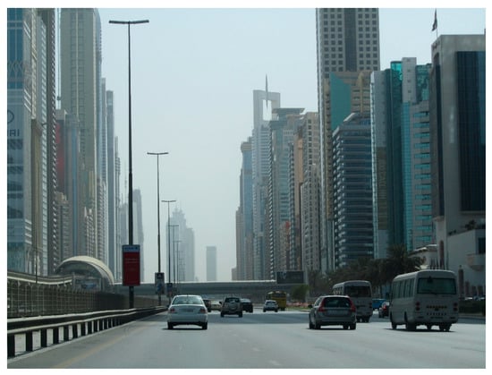 Byrne and Sipe [] (p. 17) explain that while “…most cities have a hierarchy of street types ranging from small alleys to large expressways…”, many of these “…could not be considered as green or open spaces as they are major traffic arteries” with few human activities at ground level. Indeed, most streets, which are so important in our daily life, have been reduced to ‘passages’ as opposed to ‘places’ [,]. The result has been a decline in the provision of quality outdoor public space and a reduced compactness, as witnessed in two major models of present urban expansion. The first is the horizontal suburban sprawl typical of auto-dependent cities, especially in North America and Australia, with densities that are too low and green areas that are dominated by the front and back yards of suburban homes. In such cities, there is much less in the way of public green open space and relatively few active and inviting other public environments (Figure 6). The other model is the high-density vertical ‘sprawl’ that is commonly seen in many Eastern and Middle Eastern cities and which is too often devoid of genuinely attractive and useable public open spaces with inviting human qualities (Figure 7). Both these models leave growing demands for high quality public open/green space unsatisfied. While moving along the streets, city dwellers consequently start perceiving more crowding than ever, such as jam-packed roads with cars bumper-to-bumper or city skies increasingly obscured by towering skyscrapers. Figure 8 and Figure 9 depict these issues in Dubai.