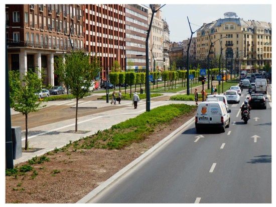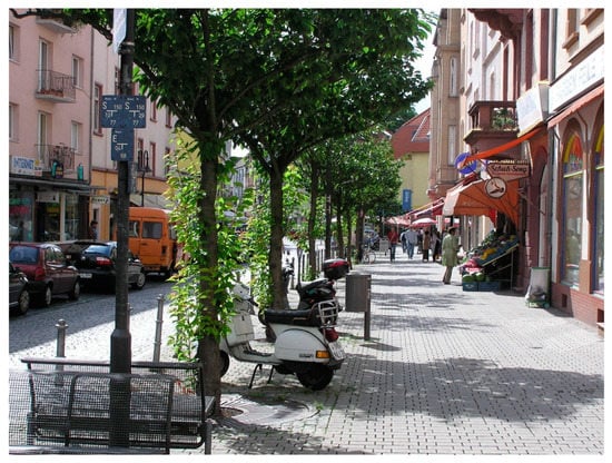 Traffic calming is a physical attempt to reduce traffic speeds to at least 30 km/h or less [,,] along both arterial roads and on smaller streets in housing areas. Thereby, traffic is not eliminated as in the most extreme and most effective form of traffic calming, which is pedestrianisation. Traffic calming is achieved through changes in street design, which involve many different physical transformations. These include chicanes, mid-block neck-downs, altered horizontal and vertical geometry of the street, 45-degree or 90-degree angle parking, widened footpaths, and provision of cycle lanes and lane reduction (e.g., 6-lane to 4-lane, or 4-lane to 2-lane roads). Green entry statements into the street are also included, such as arches, changes in street surface and colour, signage to indicate pedestrian priority, planting of trees and introduction of gardens, and provision of street furniture or even spaces for games, to turn the street at least partly into a place, not just a passage. It can also include simple changes such as the provision of pocket parks within a grid-street structure where just one short block is turned into a small park for local use, which has the effect of slowing down cars along long stretches of straight streets. Newman and Kenworthy [] provide a fuller picture of traffic calming. Figure 10 shows an example of effective traffic calming in Frankfurt am Main, Germany along Leipzigerstrasse.