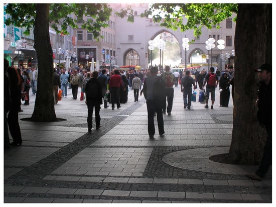 Gridlock is another typical example of crowding that is associated with the perception of high (vehicle) density and lack of space, both for vehicles and people. Considering that a root cause of a traffic jam lies in the separation of different land uses that requires cars to access dispersed daily needs, such as working and shopping, traffic alleviation cannot be achieved by mere increases in road supply [] or by only reducing the number of cars via vehicle use restrictions. As Jacobs [] (p. 348–349) puts it: “in the absence of city diversity, people in large settlements are probably better off in cars than on foot”. To create diversity and overcome automobile dependence, local streets ought to be an inviting destination, having a better jobs-housing balance, and a vibrant street life to diminish both commuting and non-work motorised traffic. Moreover, according to the theory of stimulus overload, a surfeit of stimulation such as petrol fumes or vehicle noise arising from road congestion leads to a perception of high density and such high concentrations of pollution are most likely to be evaluated as uncontrollable and unwanted, which results in negative perceptions of crowding [].