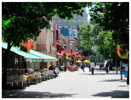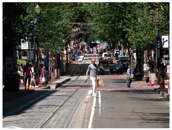 Moreover, the car is known for its insatiable appetite for space as well as for speed. As Gehl [] (p. 9) explains: “A typical scene in many Asian cities is that all available city space is simply filled with moving and parked vehicles and every city got precisely as much traffic as space would allow”. Jane Jacobs recognised these problems 60 years ago when she said: “Traffic arteries, along with parking lots, gas stations and drive-ins, are powerful and insistent instruments of city destruction. To accommodate them, city streets are broken down into loose sprawls, incoherent and vacuous for anyone afoot” [] (p. 338). Consequently, pedestrians, victims of the car, now find few other places except parks to go for a relatively carefree outdoor stroll. However, Jacobs [] also saw a solution to these problems when she prefigured the invention of traffic calming, which gives back street space for uses other than accommodating cars. She prophetically said: