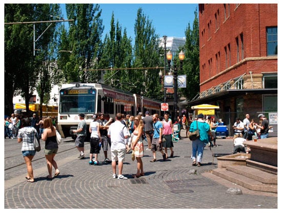Considering the unpopularity of automobile traffic, the Great Streets Initiative in Los Angeles set up the “People St” website allowing local communities and residents to apply for parklets, pedestrian plazas, and bicycle corrals []. Churchman [] (p. 407) concludes that “converting a significant proportion of the spatial resources consumed by the car to other land uses may increase the positive effects of high density and reduce the negative effects”.