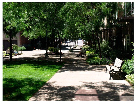 Urban open spaces, ranging from highly maintained gathering places to relatively natural landscapes, provide relief from noisy, busy, or overcrowded places and are closely associated with both perceived density and human needs. On the one hand, the human race has its origins in certain savannah landscapes that feature spreading trees, low ground cover, and water. “Nature then becomes a source of spiritual inspiration” as “viewing natural-looking settings can reduce stress and promote healing” [] (p. 273). In comparison with the asphalt and concrete of built environments, people lean towards natural things because contact with nature is consistently found in association with positive psychological well-being, including attention restoration and stress reduction []. Additionally, it has been shown that “open space provides opportunities for specific kinds of behaviour and recreation, for privacy, for reducing perceived density…” [] (p. 404). It is also found that increased visibility and a preferred view created by urban green/open space help to lower the perceived density and that a canopy of leaves and branches of street trees contributes to a moderation in the scale of wide streets and tall buildings [].