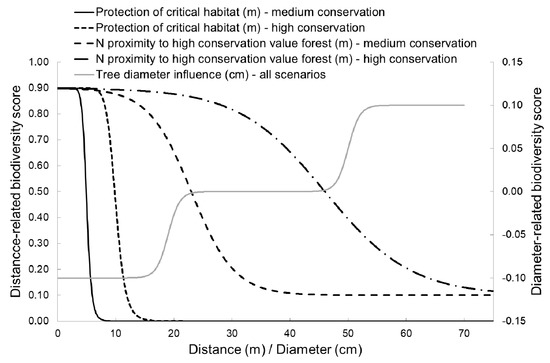The sigmoid functions used to describe the stump value dependency on distances from objects with high conservation values and diameter make the biodiversity score continuously decrease, with the distances defined above, and increase with stump diameter. In this way, differences in biodiversity scores could be calculated along the whole range of relevant distances and diameters (0 to ∞).