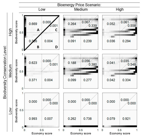 Scatterplot of production and biodiversity scores according to the MAPStump-DSS of all stumps at Abrahamsdammen for nine combinations of bioenergy price scenarios (columns) and biodiversity protection scenarios (rows). For each field in the scatterplot, the grey-scaled pixels indicate the density of stumps and numbers represent the actual proportion of all stumps (both based on dry biomass). All fields above the transverse line in the upper left large triangle (A) were given a total score S < 0.5 by the overall MAPStump-DSS and were thus not considered for harvesting. All stumps in fields B, C, and D had a total score S > 0.5 and were thus suitable for harvesting. However, the economic production model excluded stumps in the small triangle field B as not profitable. Therefore, all harvested stumps were located in fields C and D. The upper right quadrant contains conflict stumps with biodiversity scores SB > 0.5 and economic scores SE > 0.5. The small lower right triangle field in quadrant C is harvested conflict stumps while the left upper triangle field is unharvested conflict stumps.