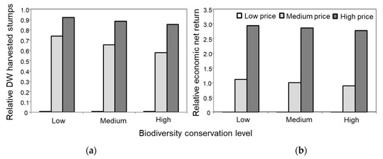 Effects of nine scenarios of stump harvest with three levels of bioenergy market prices and biodiversity conservation, respectively, on (a) the total relative dry weight (DW) of harvested stump biomass and (b) total relative economic net return from harvested stumps at Abrahamsdammen. Values are relative, where 1 represents (a) the total biomass dry weight of all stumps at the site and (b) total economic net return at medium bioenergy market price and biodiversity protection scenario. Note that the value of “low” bioenergy price is zero and “low” biodiversity conservation is no protection of stumps.