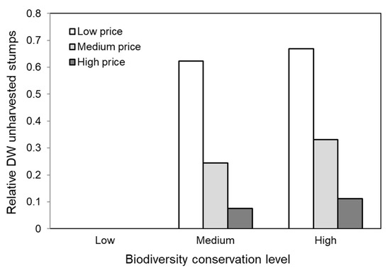 Norway spruce was harvested to a greater extent than Scots pine under medium price levels, for all biodiversity conservation scenarios (Figure 7a). The dry weight of harvested Scots pine stumps also decreased substantially with increasing biodiversity conservation at medium price, whilst the reduction of harvested dry weight of Norway spruce with increasing conservation was very small. With high price levels, however, the harvested biomass of stumps generally was equally high for both Norway spruce and Scots pine at medium and high biodiversity conservation (Figure 7a). The total stump biomass was practically the same for Norway spruce and Scots pine (49.5% and 48.7% respectively). On the other hand, the average stump diameter for Scots pine (37 cm) was larger than for Norway spruce (28 cm). A stump diameter around 50 cm and above resulted in a higher biodiversity score, which more often caused the MAPStump-DSS to protect Scots pine over Norway spruce. Scots pine was also assigned slightly higher overall biodiversity scores by experts compared to Norway spruce (Table 1). Deciduous stumps were assigned the highest biodiversity scores in interviews, so it was not surprising that the harvested deciduous tree stump biomass decreased with increasing conservation levels for both medium and high bioenergy prices (Figure 7b).