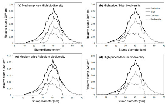 Distribution of stump biomass dry weight (DW) across stump diameters (binwidth diameter class = 1 cm) based on medium and high biodiversity criteria under medium price levels ((a,c), respectively) and high price levels ((b,d), respectively) at Abrahamsdammen. Lines represent distribution of all stumps (= total), stumps with economic scores SE > 0.5 (= production); stumps that are unsuitable to harvest from a biodiversity perspective SB > 0.5 with economic scores SE < 0.5 (= biodiversity), and conflict stumps that are economically suitable for harvest SE > 0.5 but unsuitable based on biodiversity SB > 0.5 (= conflict).