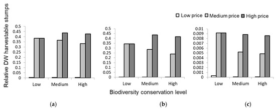 Effects of nine scenarios of stump harvest with three levels of bioenergy market prices and biodiversity conservation, respectively, on the total relative dry weight (DW) of harvested stump biomass for (a) Norway spruce (Picea abies), (b) Scots pine (Pinus sylvestris) and (c) deciduous trees (mainly Betula spp.) at Abrahamsdammen. Values are relative, where 0.5 (a,b) represents half and 0.01 (c) only 1% of the total stump dry weight.