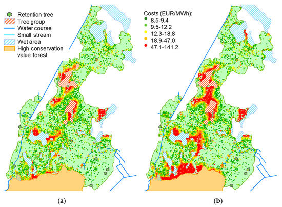 The result from the MAPStump-DSS over Abrahamsdammen study forest with dots representing unharvested individual stumps with biodiversity scores SB > 0.5 and economy scores SE < 0.5 at medium (a) and high (b) biodiversity conservation scenarios, both under the medium bioenergy price scenario. The color of the dot represents the economic cost (EUR/MWh). The continuous high cost areas are the result of the hauling time dependency on the spatial density of harvested stumps (see Supplementary Material S2).