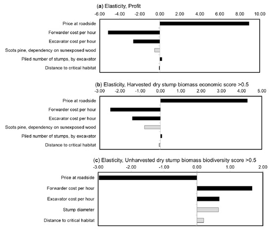 Sensitivity analysis of the DSS. Parameter sensitivity was calculated as the elasticity coefficient (relative change of model with respect to relative change of parameter) on the total economic return (profit; (a)), dry weight of the harvested stump biomass (b), and unharvested stump biomass (c). Parameters in the economy submodel are shown as black bars and parameters in the biodiversity submodel as grey bars.
