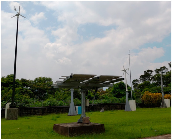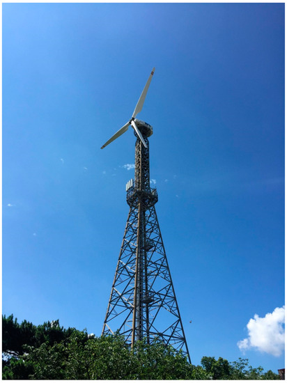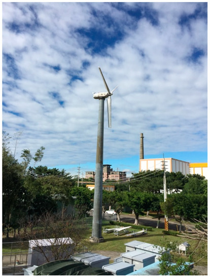 Considering the proactivity on the installation for the site in INER campus, the finalized decision on the selection of wind turbine is 1 kW system. The finalized wind farm is shown in Figure 15. The hub height is 6 m for the right-side wind turbine with three blades. For the middle wind turbine, its hub height is also 6 m with five blades. On the left side, the hub height is 10 m with three blades. Different hub heights and blade number are intentionally selected to investigate its effect on the performance of individual wind turbine and entire wind farm. The installation of wind turbine is completed, and power generation-related data are collected via the supervisory control and data acquisition (SCADA) system.