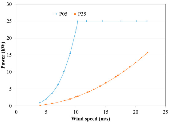The performance of INER 25 kW is generally suppressed due to safety concerns. As indicated in Figure 13, the AEP of the case of P05 is only 25% lower that of the 150 kW wind turbine, while it is significantly reduced to about 12 MWh with pitch angle of 35 degrees which is employed during most of the operation. For the effect of employed weather data, higher AEP can be obtained with the weather data of Hall-039, and a much lower value is observed when switching to that of Hall-048. For the reduction from Hall-039 to Hall-048, it is 57% for the 150 kW wind turbine, and it is 31% for 25 kW P05. The reduction is only 6% for 25 kW P35 since its performance is highly suppressed.