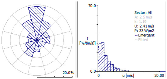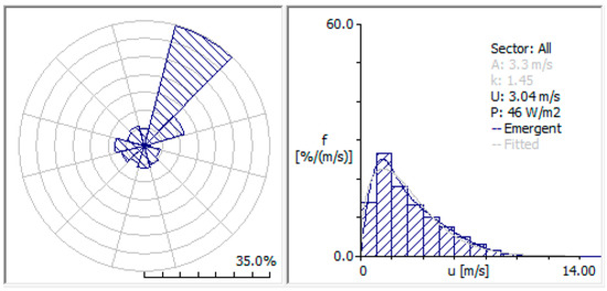By importing time sequential wind speed and direction, the statistical wind data can be obtained and expressed by the Weibull probability density distribution function in Equation (1)