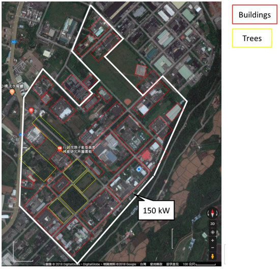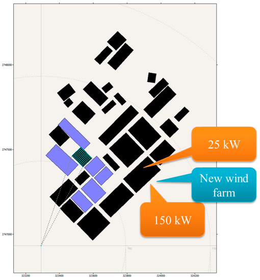 In Figure 11, the layout of the modeled buildings is indicated. Buildings are built as the black rectangles with zero porosity, and trees are built with blue rectangles with porosity of 0.5 as suggested from the User Menu of WAsP 11. The locations of the 25 and 150 kW horizontal axis wind turbine (HAWT) are indicated as the originally existing system. For the newly installed wind turbine, the 1 kW, 5 kW and 30 kW HAWT systems are employed. Three new wind turbines are virtually installed near the wall of the INER campus next to the 150 kW wind turbine.