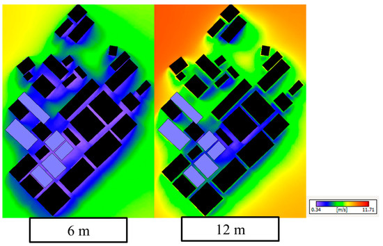 Calculated distributions of wind speed by the proposed WAsP model at the height of 6 m and 12 m are presented in Figure 12. The distribution of wind speed at the height of 6 m is significantly influenced by the nearby buildings. It is expected that the AEP of a wind turbine with hub height below 10 m will significantly decrease. At the height of 12, the speed reduction zones are smaller since the heights of the majority buildings of INER are about 10 m. Therefore, the performance for planned wind turbine with hub height higher than 10 m should be better.