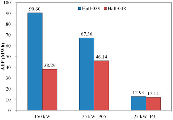 When introducing the 5 kW wind turbine system, the AEP obviously increases from 13 to 24 MWh. The generated AEP due to the switch of weather data from Hall-039 to Hall-048 increases, which is opposite to the following two investigated cases. Such variation is also observed in the case of 1 kW with very small increment.