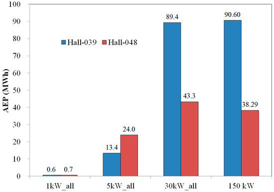 For the case of 30 kW, the corresponding AEP increased from 43 to 89 MWh (sum of three wind turbines). The AEP drastically decreases when switching the weather data from Hall-039 to Hall-048, which is consistent with the cases of INER-25 kW and INER-150 kW.