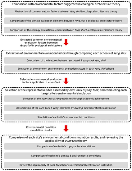 However, since modern buildings have a lifeline (like water and gas supply) to acquire resources, it is possible to form residences in areas such as slopes and hills. This means that even sites that were not suitable as residential areas in the past should now be evaluated as living zones. In other words, applying feng shui to the modern architecture system with only the research of the theory of living may not evaluate the regional characteristics of the terrain. Therefore, in order to examine the possibility of ancient evaluation methods being applied to modern architecture, it is necessary to reflect both theories together. Accordingly, this research aims to explore the modern applicability of eum-taek theory in feng shui thought as summarized in Figure 1.