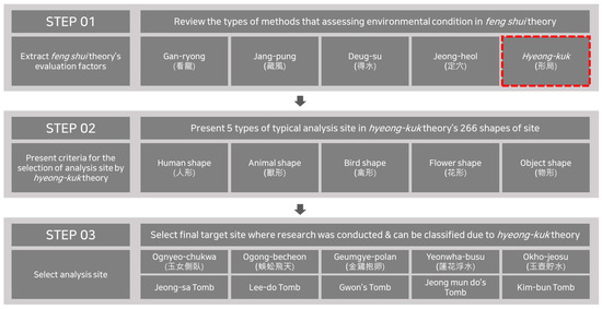 The candidate regions selected for analysis satisfy the first condition for analysis. However, classification steps according to type are required, since the conventional concept of location applied to each region is all individual. If there is a unified type of feng shui theory that is applicable to all analytical sites, the analytical sites can be clearly compared. Because traditional site assessment is a complex theory that employs various concepts of land use, it can have differences in the method of evaluating the region and the basic logic. The Hyeong-kuk theory mentioned in Section 1 classifies the types of regions in the form of the five evaluation indices presented above. Therefore, it is possible to select an analysis site that can be clearly compared by performing a secondary classification using the proposed theory as seen on Figure 2.