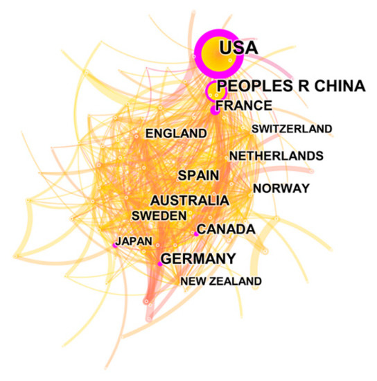 14]. Thus, the more central a country/region or institution, the greater is the number of its publications with others. In total, 2831 papers on ES research were obtained for the 1992–2019 period after performing the “remove duplicates” function in CiteSpace. The visualization map for countries where ES research has occurred was produced with the aid of the pruning parameter (pruning based on Pathfinder/Pruning sliced networks). After running the software, 100 nodes and 680 links were included in the network, and the density was 0.1374 (