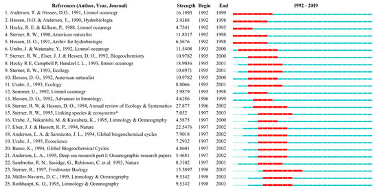 Table S7) co-cited references ranked by the strongest citation bursts. The top reference was written by Sterner and Hessen and published by the