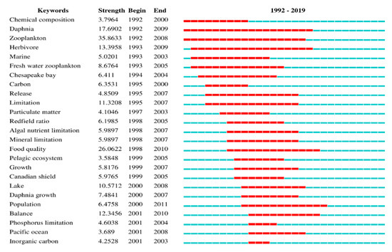 Figure 10, zooplankton (35.8633) had the strongest keyword burst, followed by food quality (26.0622), daphnia (17.6902), herbivore (13.3958), balance (12.3456), limitation (11.3208) and lake (10.5712). However, the longest period of a keyword burst was for daphnia (18), followed by zooplankton (17), herbivore (17), freshwater zooplankton (13) and release (13). In summary, we observed that the study of consumer stoichiometry and nutrient cycles has focused on aquatic ecosystems. With the development of ES theory, researchers have changed their focus from aquatic ecosystems to consumer stoichiometry and the nutrient cycle in other ecosystems. For example, researchers have used ES theory to examine the response of grassland ecosystems [