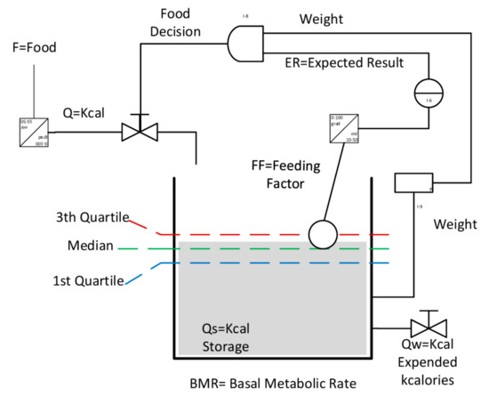 | Diet | Auxiliary variable that represents nutritional variation. This variation on the planned standard food depends on the Index variable. <<Diet = IF THEN ELSE(Index < 0,α,0) + IF THEN ELSE(Index = 0.5,β,0)++ IF THEN ELSE(Index = 1,γ,0)>>, where α, β, and γ are calories (kcal) of standard portions of food most commonly used to increase or decrease the diet (Table 7). | kcal |