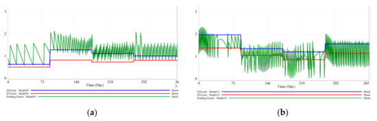 | Food | Auxiliary variable that expresses standard feeding plan (in kcal), estimated by means of case study analysis; most commonly 150 kcal. <<Food = PULSE(0,366) × 150>> | kcal |